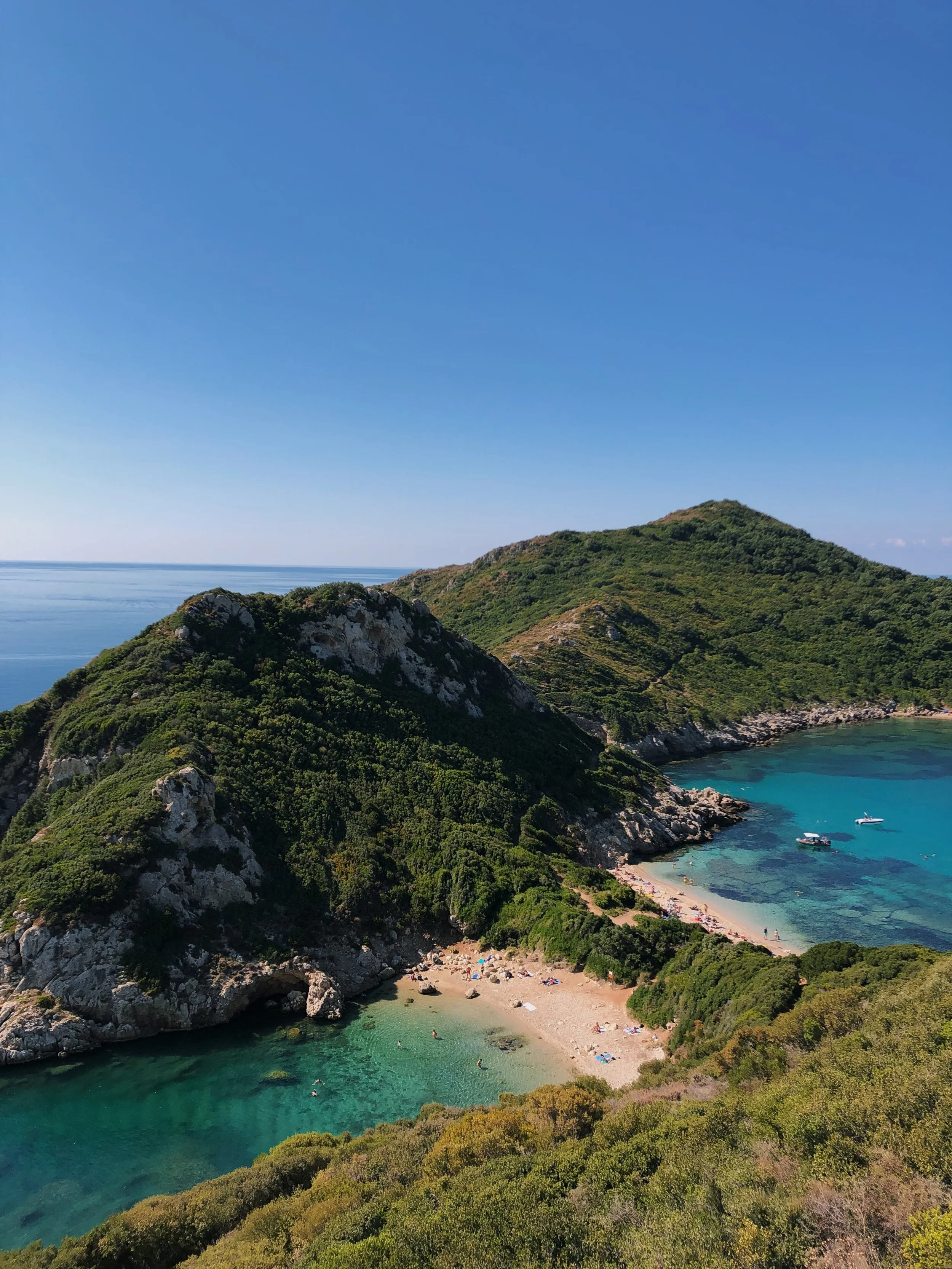 Hike to Porto Timoni – an iconic beach in Corfu, with two distinct bays, separated by a narrow strip of land. Accessible by boat or a scenic hike from Afionas village, this idyllic spot is encircled by lush green hills and crystal-clear waters, making it ideal for sunbathing and swimming.